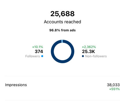 The analytics from working with my client one month into my tenure as a social media manager for a small business versus the current analytics speak volumes